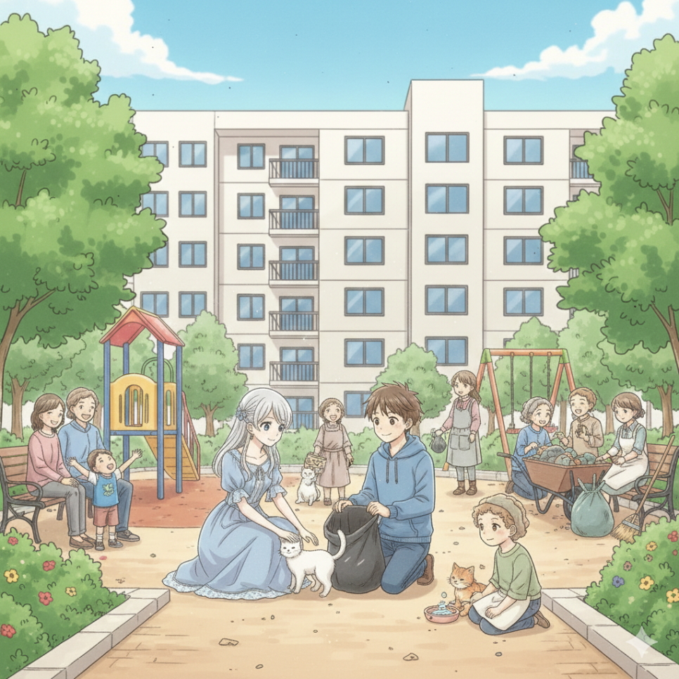 루나와 친구들은 공원에서 쓰레기를 줍고, 길 잃은 고양이를 돌보았어요.