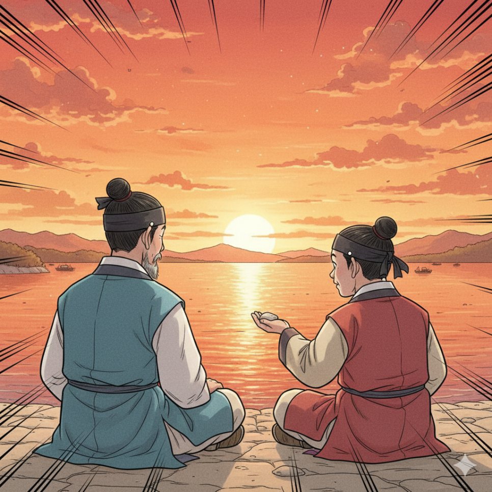 김선달이 부드럽게 말했어요. "나리, 세상은 흑과 백만으로 나뉘지 않습니다. 때로는 상황에 따라 유연하게 행동해야 할 때도 있지요. 정직은 중요하지만, 지혜도 함께 필요합니다." 선비는 김선달의 말을 깊이 생각해보았답니다.
