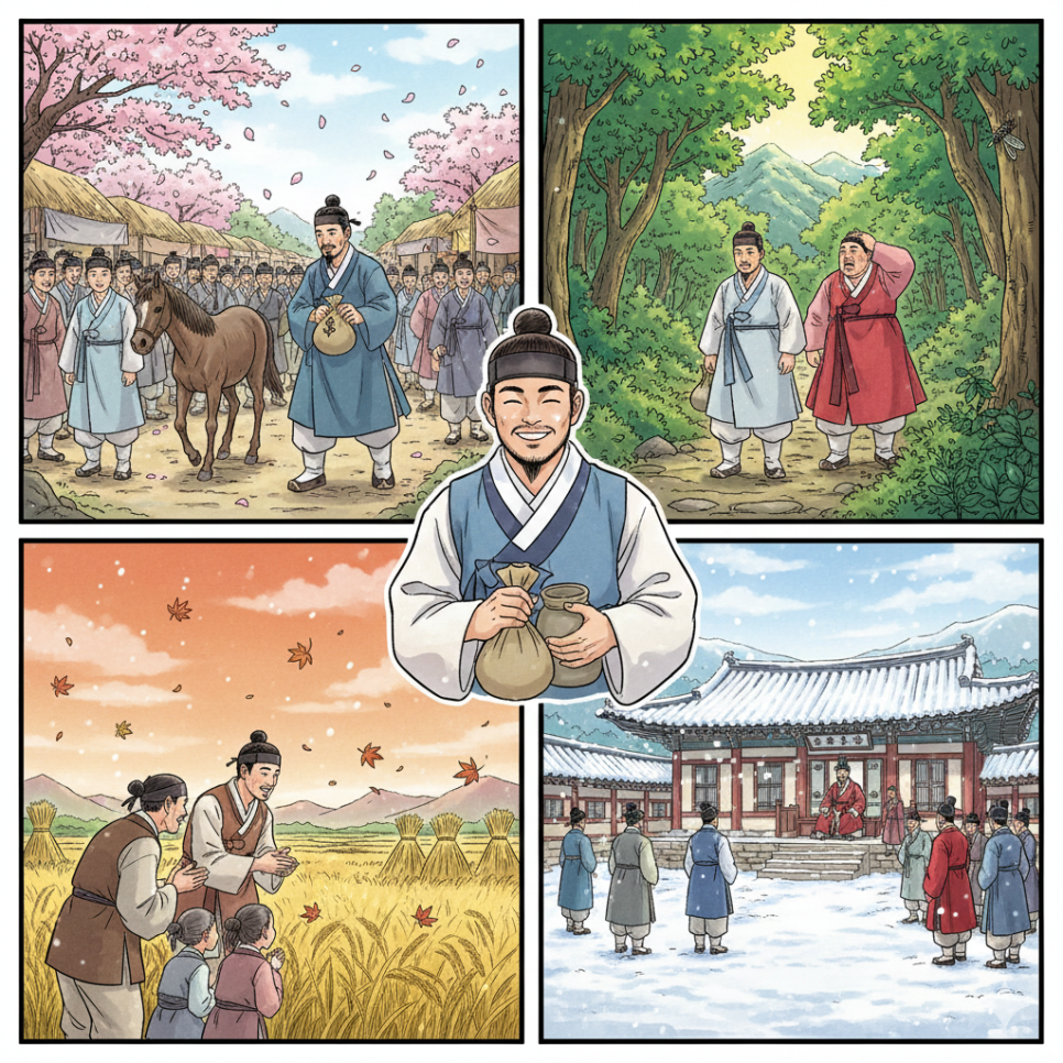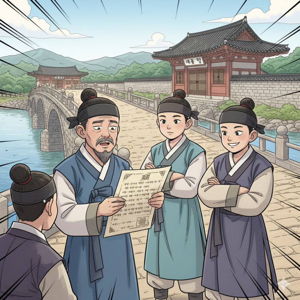 세 번째는 가장 대담했어요. 김선달은 관복을 입고 임금의 사신인 척했어요. "상인 나리를 궁궐로 모시러 왔습니다." 상인은 영문도 모른 채 따라갔다가 중간에 진짜 관리를 만나 거짓인 줄 알았지요.