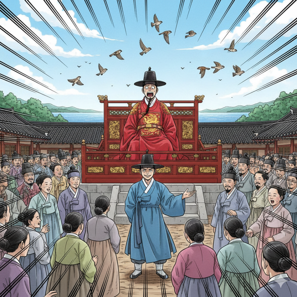 감사가 내기를 제안했어요. "내가 세 가지 문제를 내겠다. 하나라도 풀지 못하면 곤장을 맞을 것이다!" 첫 번째 문제는 이것이었어요. "평양성 안에 참새가 몇 마리 있는가?" 사람들은 모두 어려운 얼굴을 했지요.