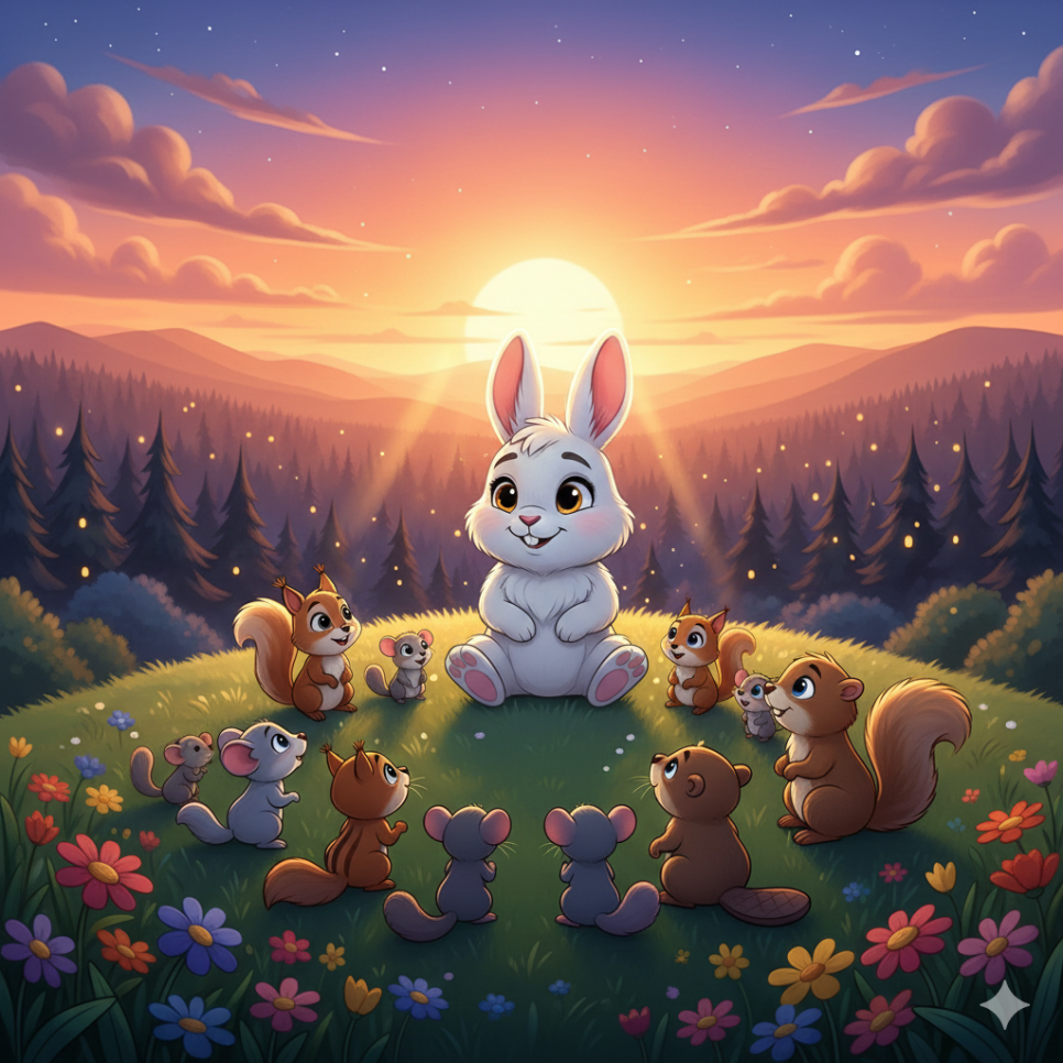 어린 동물들은 반짝이는 눈으로 토끼의 이야기를 들었습니다. 그날 밤, 숲속 곳곳에서 어린 동물들이 부모님께 말했습니다. "저도 토끼 선생님처럼 지혜롭게 되고 싶어요!" 그리고 그들은 꿈을 꾸었습니다. 자신들도 언젠가 다른 이들에게 도움이 되는 훌륭한 어른이 되는 꿈을.