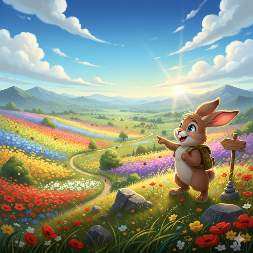 "토끼 선생님, 저는 느려서 친구들을 따라갈 수가 없어요." 어린 거북이가 슬픈 목소리로 말합니다. 토끼는 거북이 할아버지와 함께 배운 지혜를 떠올리며 말합니다. "천천히 가는 것도 하나의 방법이란다. 빨리 가는 친구들은 주변을 제대로 보지 못하지만, 천천히 가는 너는 길가의 아름다운 꽃도 보고, 작은 생명들도 발견할 수 있어. 그리고 기억하렴, 꾸준히 가다 보면 언젠가는 목표에 도착하게 되어 있어."