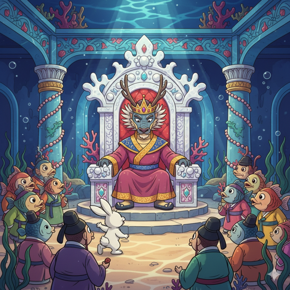 어느 날 바닷가를 산책하던 토끼는 거북이를 만났습니다. "토끼님, 용왕님께서 병이 나셨어요. 토끼의 간이 약이 된다고 하시는데, 용궁에 함께 가주실 수 있나요?" 거북이가 정중하게 부탁했습니다. 토끼는 용궁이 궁금하기도 하고 용왕님을 도와드리고 싶어서 거북이 등에 올라탔습니다. 신비로운 용궁에 도착한 토끼는 화려한 궁전에 감탄했습니다. 하지만 용왕님 앞에 서자 진실을 알게 되었습니다. 용왕님은 정말로 토끼의 간을 빼내려 했던 것입니다! 토끼는 놀랐지만 침착하게 말했습니다. "용왕님, 제 간이 필요하시다니 영광입니다. 하지만 큰 문제가 있습니다." "무슨 문제인가?" 용왕님이 물었습니다. "저희 토끼는 간을 몸 밖에 보관하는 습성이 있습니다. 오늘은 간을 집에 두고 왔어요. 다시 땅으로 올라가서 가져올 수 있게 해주세요." 토끼가 진지하게 말했습니다. 용왕님은 토끼의 말을 믿고 다시 거북이 등에 태워 보냈습니다. 육지에 도착하자마자 토끼는 재빨리 뛰어가며 외쳤습니다. "간은 제 몸속에 있어요! 다시는 속지 마세요!" 토끼는 지혜로 위기를 벗어났고, 용왕님은 토끼의 재치에 감탄할 수밖에 없었습니다.