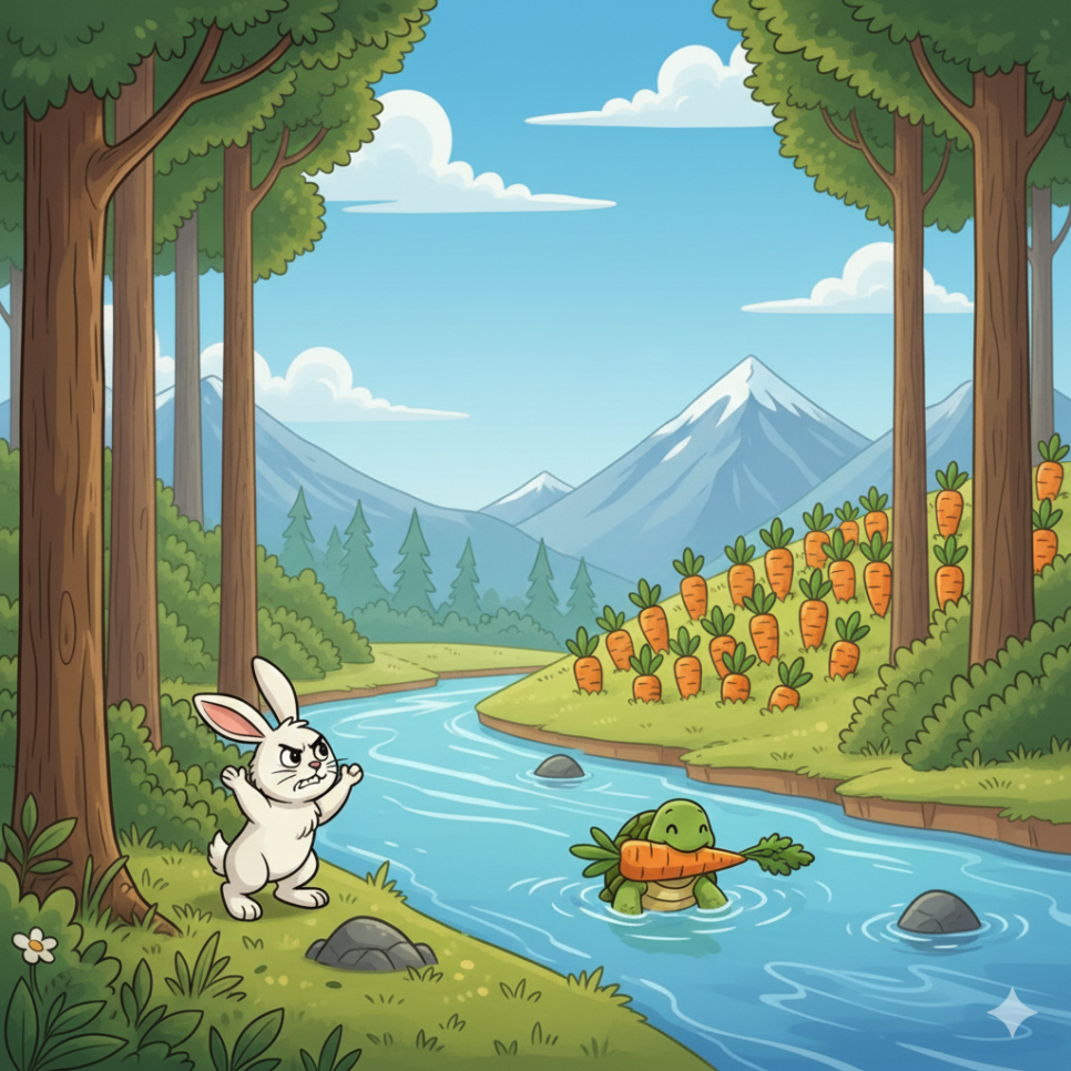 연못가에서 토끼가 거북이를 만났습니다. "거북아, 너는 정말 느리구나. 나는 빠르고 게다가 머리도 좋아!" 토끼가 자랑했습니다. 거북이는 조용히 웃으며 말했습니다. "토끼야, 빠른 것만이 최고는 아니란다. 지혜 대결을 해볼까?" "좋아! 무슨 대결인데?" 토끼가 신이 나서 물었습니다. 거북이가 말했습니다. "저기 강 건너편에 있는 당근밭에서 당근 세 개를 가져오는 거야. 단, 물에 젖지 않고 가져와야 해." 토끼는 자신만만하게 강가로 달려갔습니다. 하지만 강물이 너무 깊어서 건널 수가 없었습니다. 토끼는 여기저기 뛰어다니며 다른 방법을 찾았지만 소용없었습니다. 반면 거북이는 천천히 물속으로 들어가 유유히 헤엄쳐 건너편으로 갔습니다. 당근 세 개를 입에 물고 다시 헤엄쳐 돌아온 거북이는 토끼에게 말했습니다. "토끼야, 빠른 것도 중요하지만 상황에 맞는 능력이 더 중요하단다. 나는 물속에서 살기 때문에 물에 젖지 않는다고 생각하지 않아. 이것이 바로 지혜란다." 토끼는 고개를 끄덕이며 자신의 자만을 반성했습니다. 그날 이후 토끼는 거북이를 존중하게 되었고, 두 친구는 서로의 장점을 배우며 더 가까운 친구가 되었습니다.