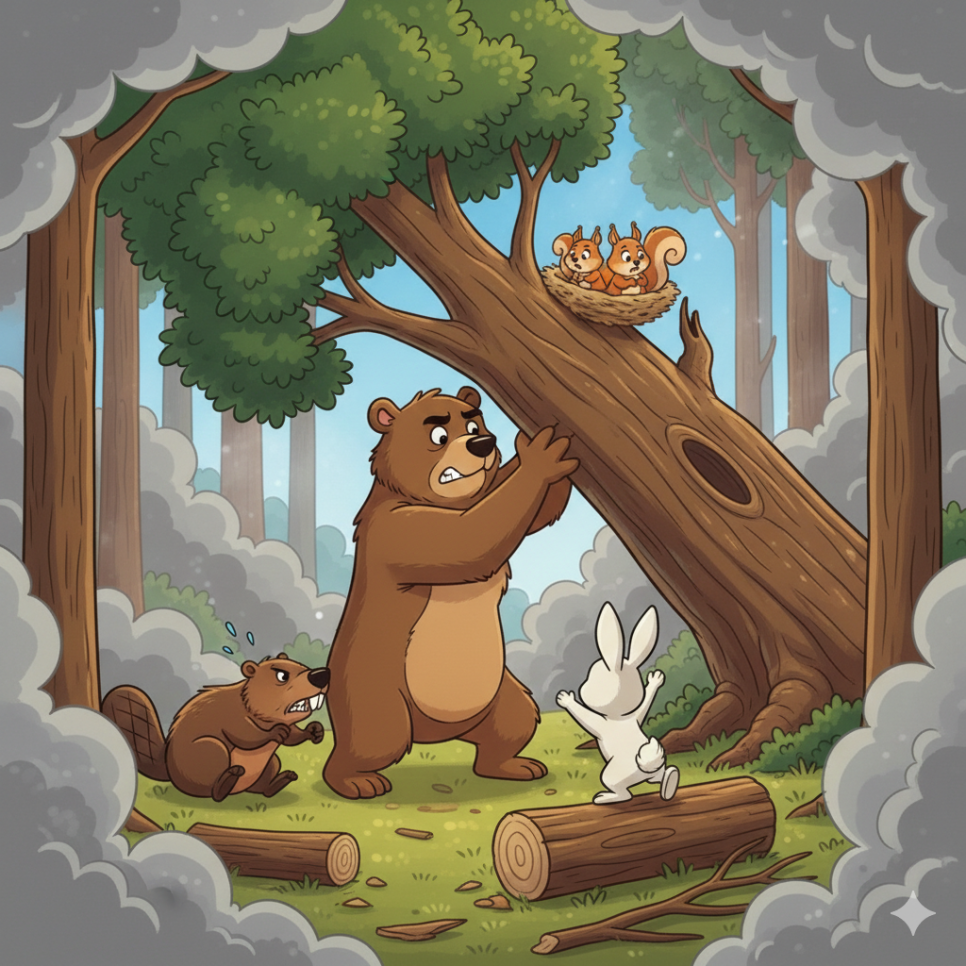 어느 날 숲속에 산불이 났습니다. 바람이 세게 불어 불길이 빠르게 번졌습니다. 동물들은 공포에 질려 이리저리 도망갔습니다. 토끼도 겁이 났지만, 작은 새끼 다람쥐들이 높은 나무 위 둥지에 갇혀 있는 것을 발견했습니다. 어미 다람쥐는 울며 말했습니다. "내 새끼들이 아직 날지 못해요. 어떡하죠?" 토끼는 빠르게 생각했습니다. 혼자서는 나무에 오를 수 없었지만 지혜를 발휘했습니다. "비버야! 저 나무를 불이 오기 전에 쓰러뜨릴 수 있니?" 토끼가 외쳤습니다. 비버는 날카로운 이빨로 빠르게 나무를 갉아냈습니다. 하지만 나무가 쓰러지면 새끼들이 다칠 수 있었습니다. "곰아! 저기 서서 나무가 쓰러질 때 받아줘!" 토끼가 지시했습니다. 나무가 천천히 기울자 곰은 힘을 다해 나무를 붙잡아 천천히 땅에 내려놓았습니다. 새끼 다람쥐들은 안전하게 구조되었습니다. 모든 동물들이 안전한 곳으로 대피한 후, 비가 내려 불은 꺼졌습니다. 동물들은 토끼에게 감사했습니다. "토끼야, 네가 침착하게 모두를 이끌어줘서 우리 모두 살았어!" 토끼는 겸손하게 말했습니다. "우리 모두의 힘을 합쳤기 때문이에요. 혼자서는 할 수 없었어요."