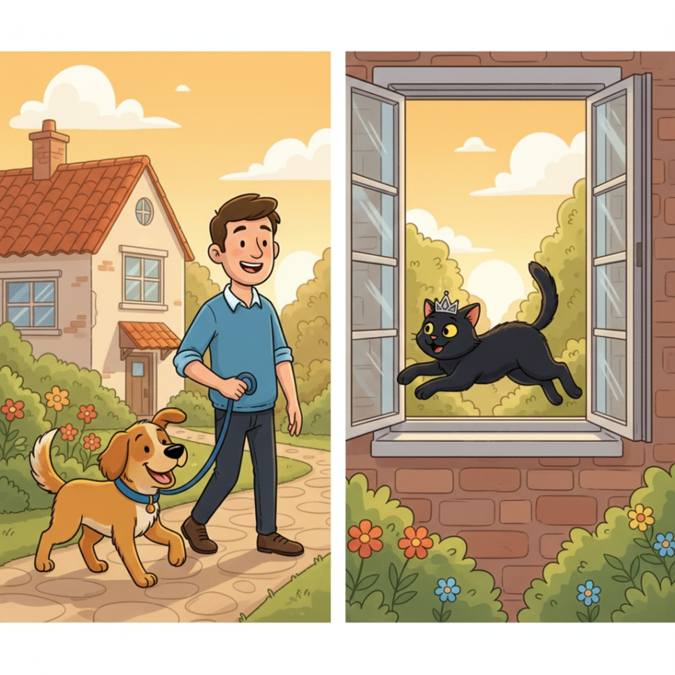 사람들은 개와 고양이를 집으로 데려가 함께 살기 시작했어요. 그런데 시간이 지나면서 개와 고양이는 다른 선택을 하게 되었답니다.