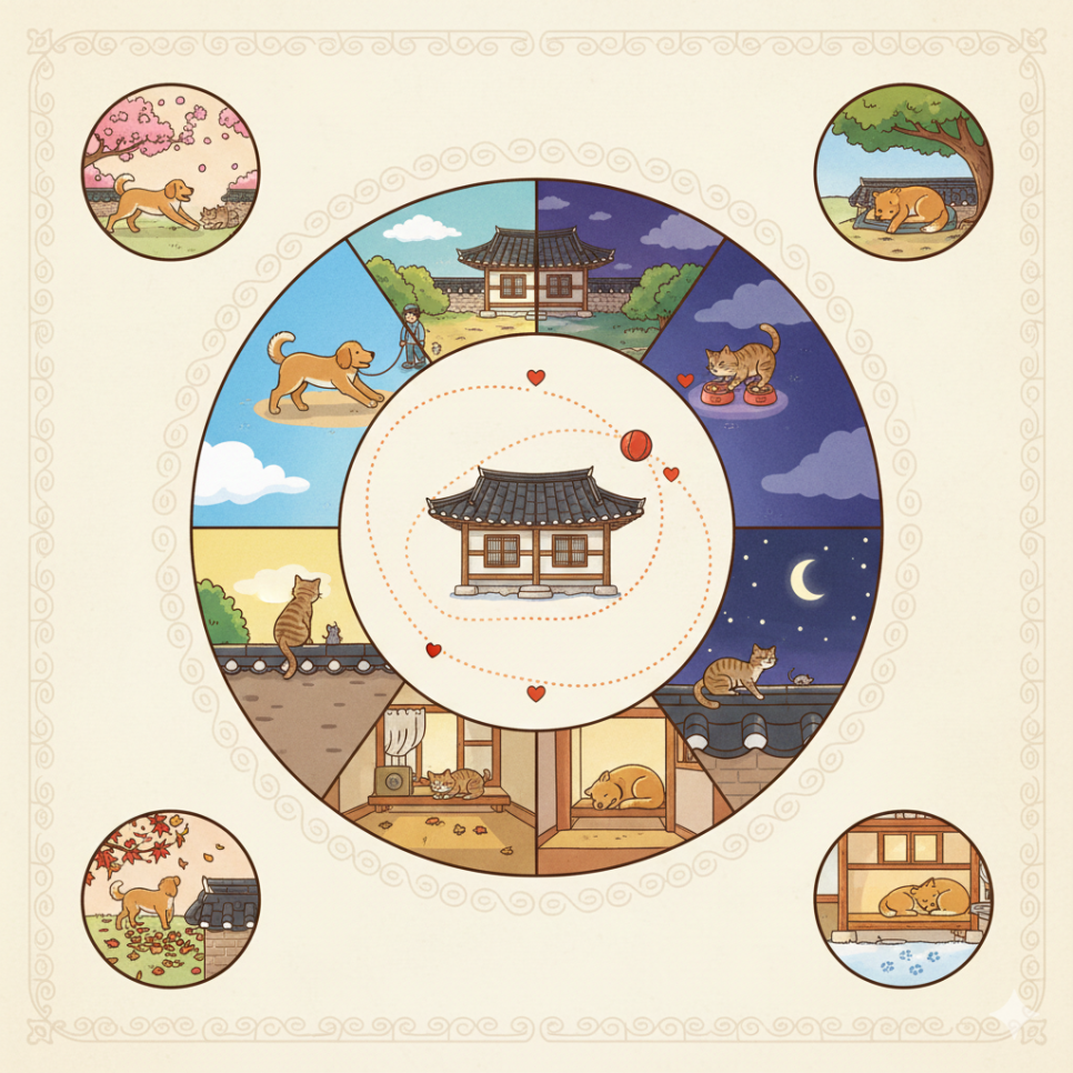 할머니는 마당을 가리켰답니다. 저녁 햇살 아래, 개는 개집 앞에서 편안하게 누워 있었고, 고양이는 담장 위에서 우아하게 앉아 마을을 바라보고 있었어요. 그런데 가만히 보니, 개와 고양이가 서로를 힐끗힐끗 쳐다보고 있었답니다.