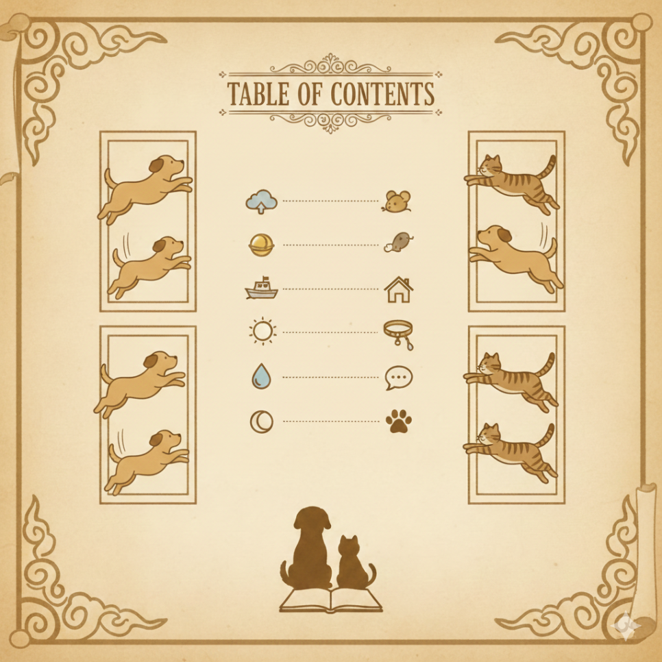오늘날에도 개와 고양이는 그렇게 살고 있어요. 으르렁거리면서도 같은 집에서, 서로 다르지만 함께. 이것이 개와 고양이의 오랜 이야기랍니다.