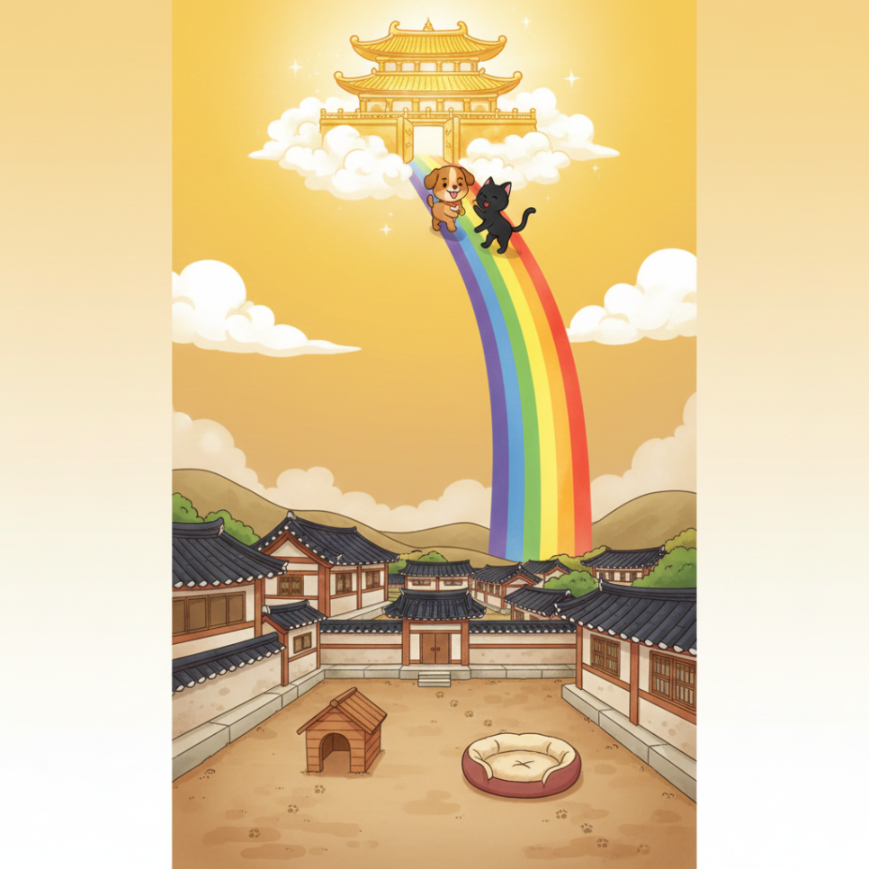 그렇게 개와 고양이는 하늘나라에서 땅으로 내려오게 되었답니다. 긴 무지개 다리를 건너 사람들이 사는 마을로 향했지요. 개는 신나게 뛰어가고, 고양이는 우아하게 걸어갔어요. 이것이 개와 고양이가 사람과 함께 살게 된 시작이었답니다.