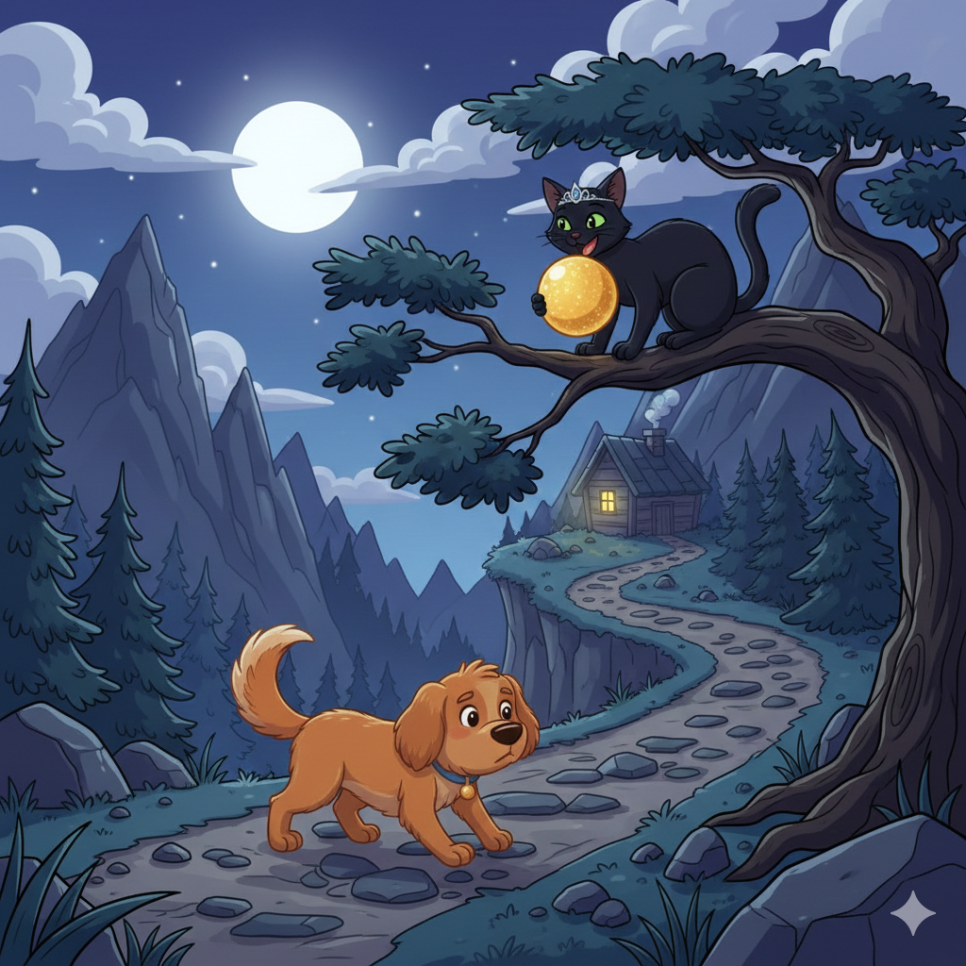 마침내 도둑의 집을 찾았어요! 하지만 황금 구슬은 높은 선반 위에 있었답니다. 개는 뛰어올랐지만 닿지 않았고, 고양이가 날쌔게 기어올라가 황금 구슬을 입에 물었어요.