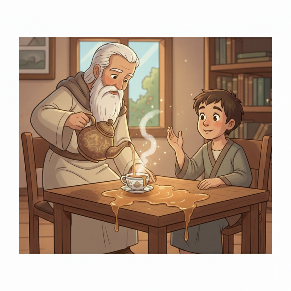 현자가 미소 지으며 말했습니다. "이 찻잔처럼, 당신의 마음도 이미 가득 차 있습니다. 자만으로 가득 찬 잔에는 새로운 것이 들어갈 수 없습니다. 진정한 지혜는 먼저 자신의 잔을 비울 줄 아는 것입니다."