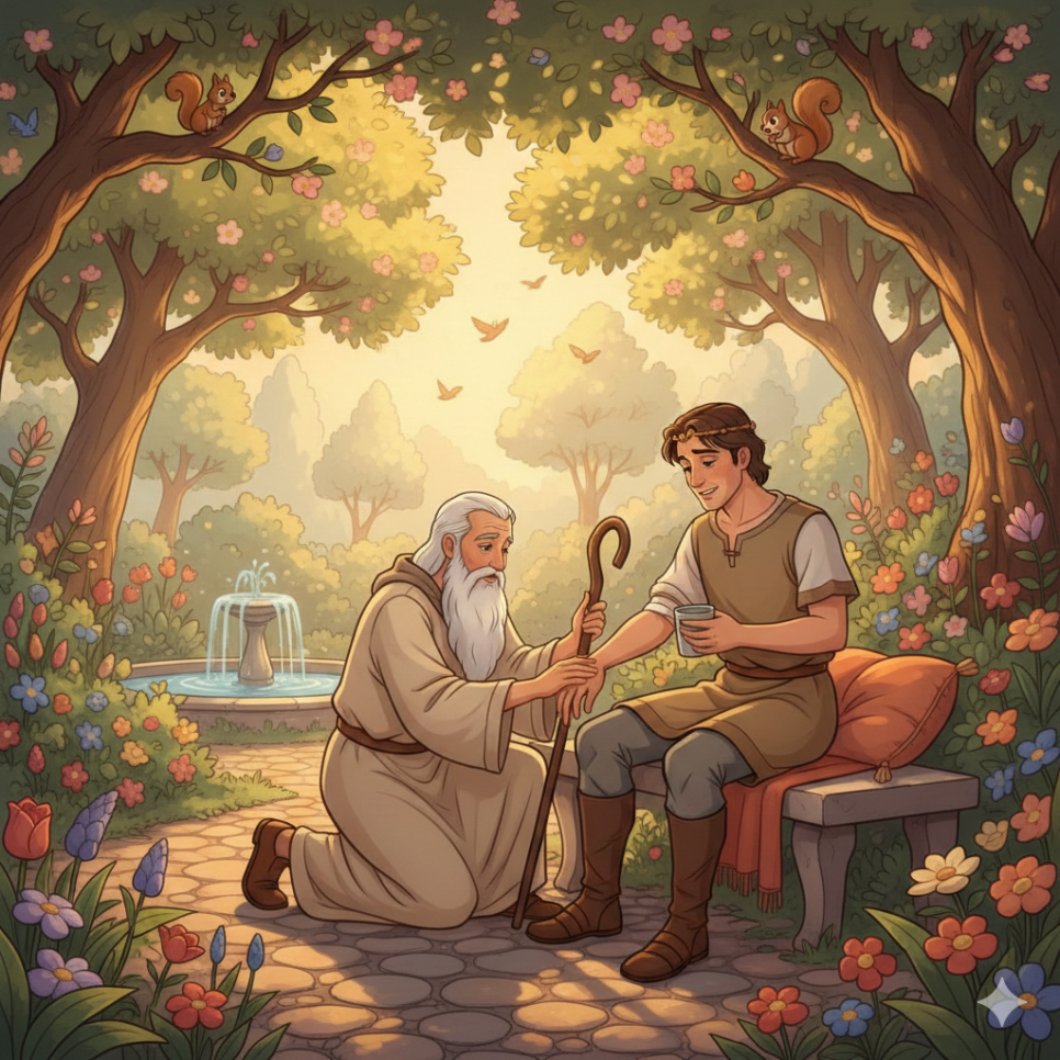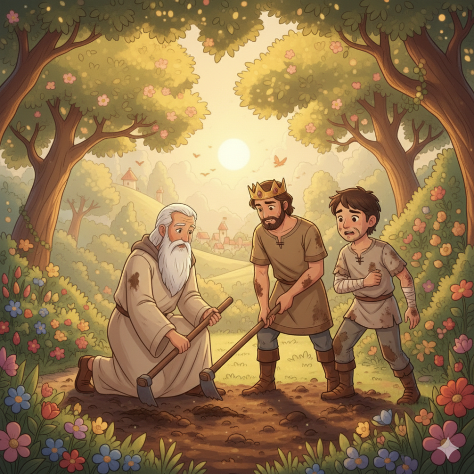 다음 날, 왕은 화려한 옷을 벗고 평범한 옷을 입고 현자의 작은 정원으로 갔습니다. 현자는 밭을 갈고 있었고, 왕도 함께 일을 도왔습니다. 그때 피투성이가 된 남자가 비틀거리며 다가왔습니다. 현자와 왕은 즉시 그를 돌보았습니다. 상처를 씻기고 붕대를 감아주었습니다.