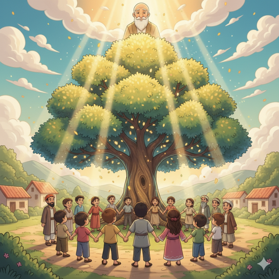 하산은 무릎을 꿇고 용서를 빌었습니다. 현자는 그에게 한 번의 기회를 더 주었습니다. 이번에는 하산이 진심으로 첫 번째 열매를 가난한 아이에게 주었습니다. 그 순간, 나무는 더욱 많은 황금 망고로 가득 찼습니다. 하산은 그날부터 마을의 가난한 사람들과 부를 나누는 법을 배웠습니다.