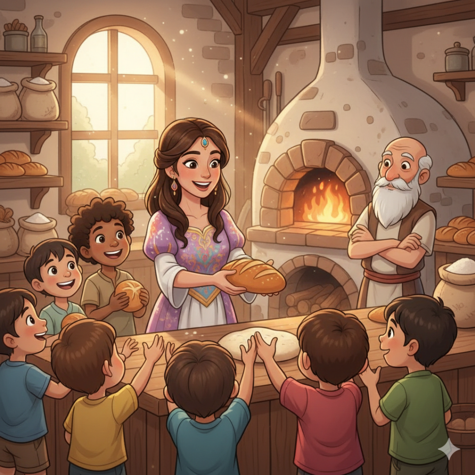 "내가? 공주가 빵을?" 자히라는 당황했지만, 호기심이 생겼습니다. 그녀는 생애 처음으로 밀가루를 반죽했습니다. 손이 더러워지고, 옷에 가루가 묻었습니다. 빵은 모양이 이상했지만, 오븐에서 막 구워져 나왔습니다.