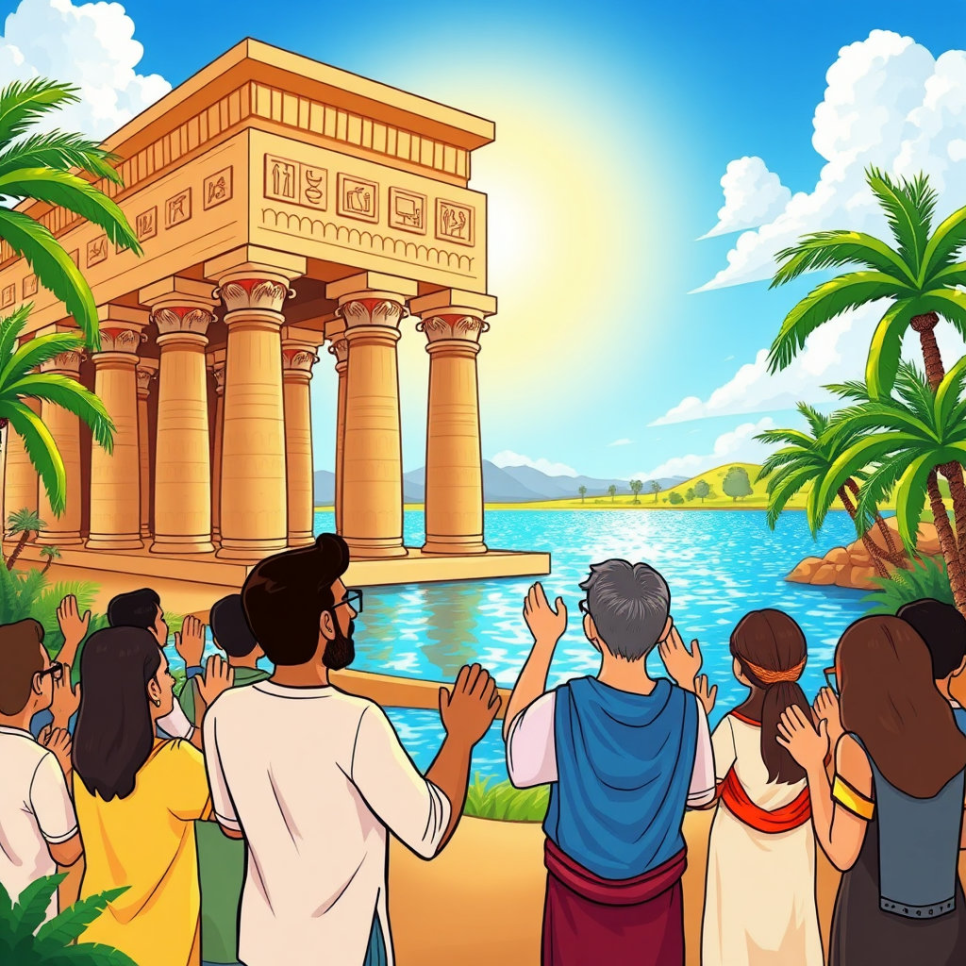 이집트 사람들은 미이라와 파라오가 신들의 보호를 받는다고 믿었어요. 나일강은 생명의 강으로, 신들이 강을 통해 축복을 내려준다고 했지요. 리나는 나일강 근처 신전에서 사람들이 신에게 기도하는 모습을 보았어요. 파라오와 미이라는 신들의 축복을 받으며 영원히 평화롭고 안전하게 지낼 수 있다고 해요. 리나는 신비로운 의식과 아름다운 신전 건축물에 감탄했답니다.
