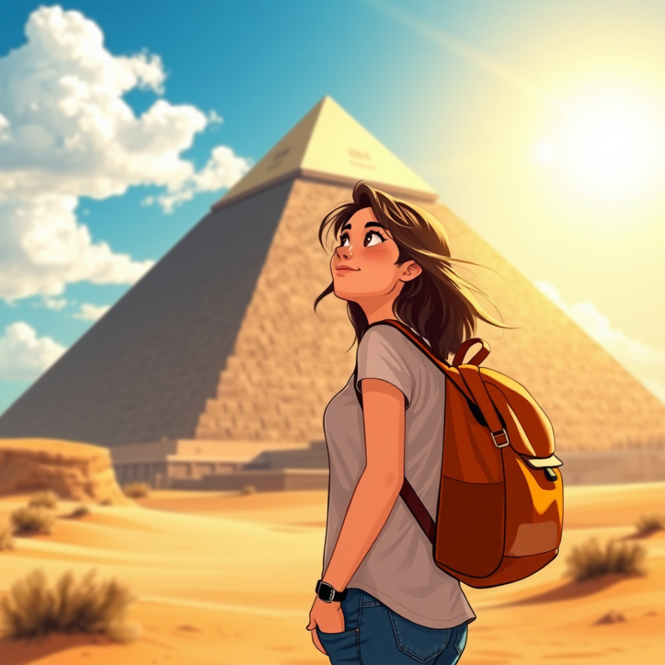 태양이 작열하는 넓은 사막 한가운데, 어린 탐험가 리나는 커다란 여행 가방을 들고 이집트로 떠났어요. 리나는 수업 시간에 배운 피라미드와 미이라 이야기가 너무 신기해서 직접 보고 싶었답니다. 모래바람 속에서 피라미드의 거대한 모습을 처음 마주한 리나는 눈을 크게 뜨고 감탄했어요. 사막의 뜨거운 공기와 끝없이 펼쳐진 모래언덕, 그리고 저 멀리 반짝이는 나일강까지, 모든 것이 리나의 모험심을 자극했지요. 이 여행이 얼마나 신기하고 특별한 경험이 될지 리나는 아직 몰랐어요.