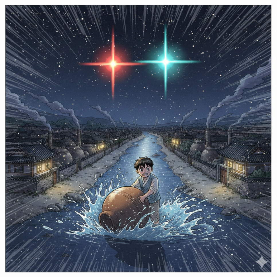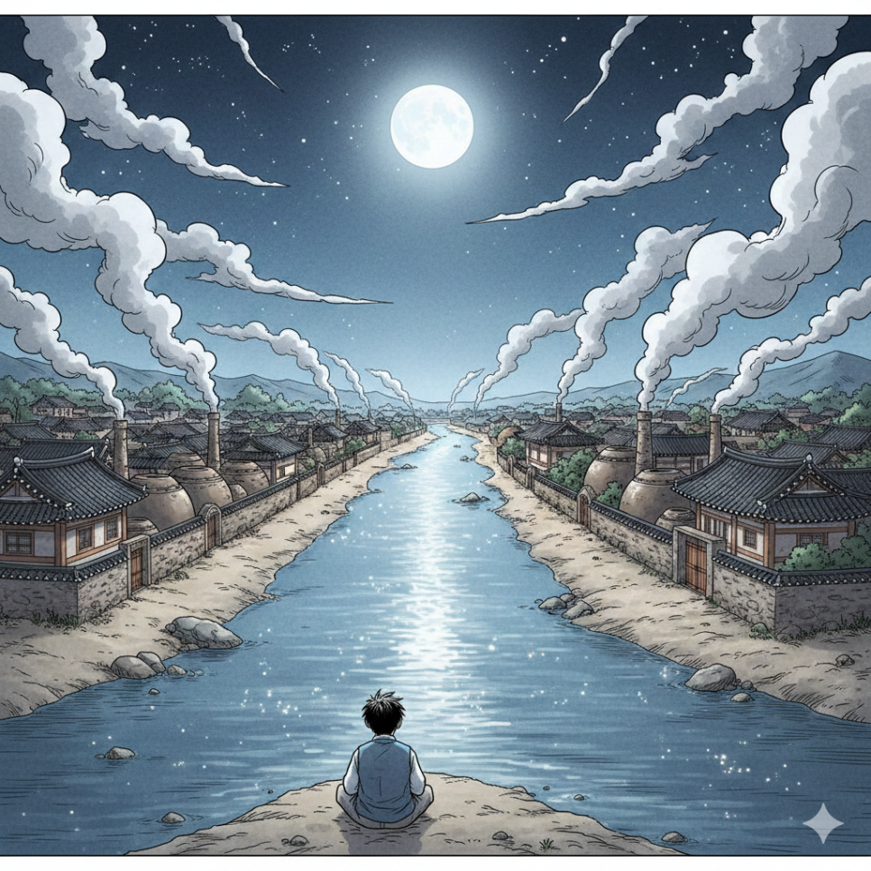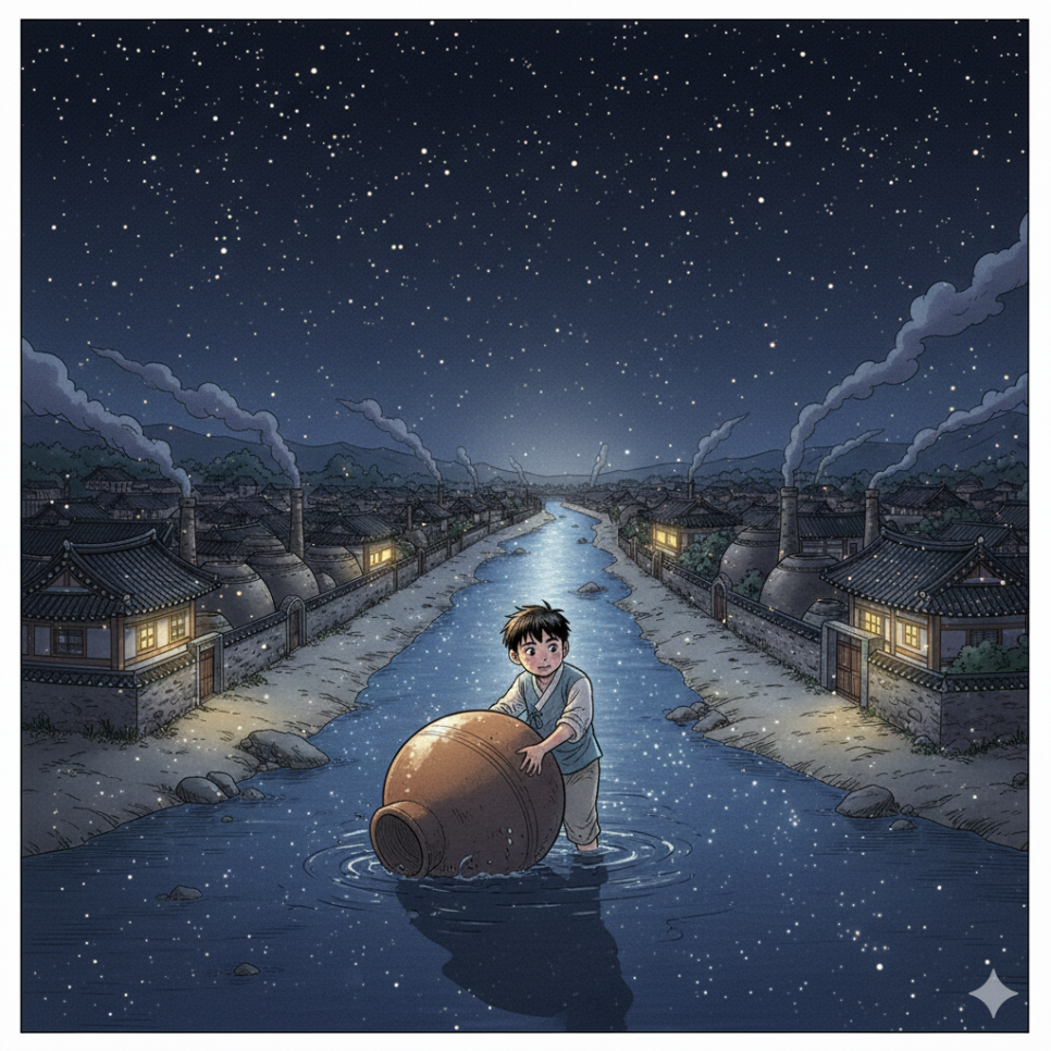 그날부터 소니는 매일 밤 항아리 두 개를 안고 강을 건넜습니다. 별이 반짝이고 달이 떠오르면, 소니는 살며시 집을 나와 강가로 향했어요. 항아리는 소니의 약속이었습니다. 오늘 밤도, 내일 밤도, 당신 곁에 있겠다는 약속.