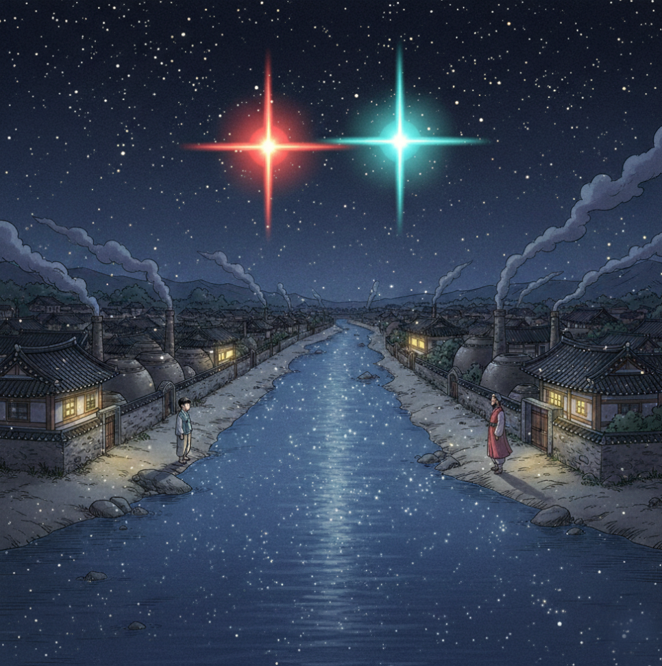 낮에는 가끔 시장에서, 강가에서 만날 수 있었지만, 마을 어른들의 눈이 있어서 오래 이야기하기가 어려웠습니다. 그래서 두 사람은 밤하늘의 별을 약속 삼았어요. '저 별이 강 한가운데 올 때, 우리 각자 강가에 나와 서로를 보자.'