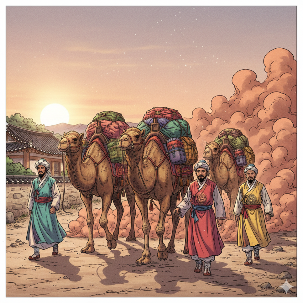 소니가 열다섯 살이 되던 어느 봄날, 마을에 낯선 손님들이 찾아왔습니다. 낙타를 타고 먼 길을 걸어온 상인 무리였어요. 그들은 멀리 부하라에서 온 사람들로, 비단과 향신료를 팔러 이 마을에 들른 것이었습니다.