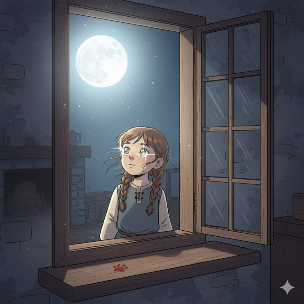 그날 밤, 창가에 작은 붉은 발자국이 남았어요.