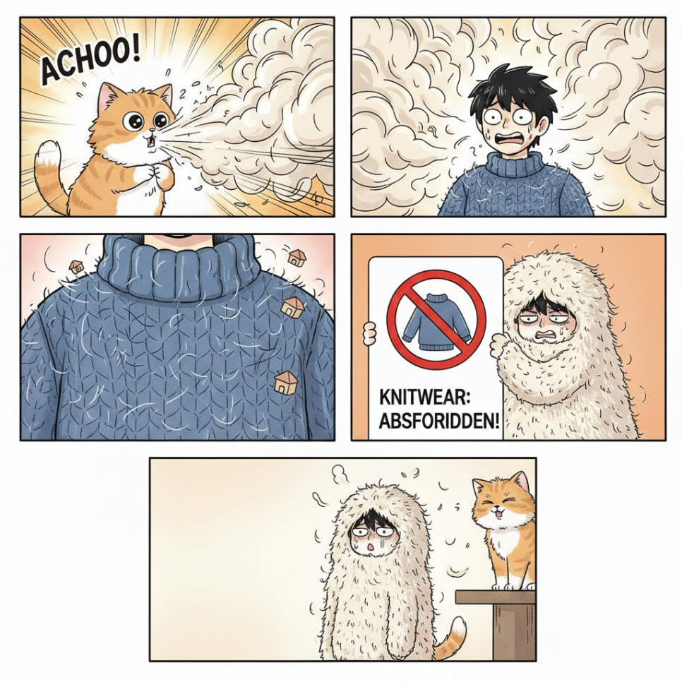 털갈이 시즌에 가장 조심해야 할 것은 '재채기'입니다. 한 번 재채기를 시작하면 공중에 정체되어 있던 털들이 동시다발적으로 비상하며 지옥의 연쇄 반응을 일으키거든요. 아, 그리고 니트 재질의 옷은 이 시기에 절대 금지입니다. 털들이 니트 조직 사이사이로 이사를 가거든요.