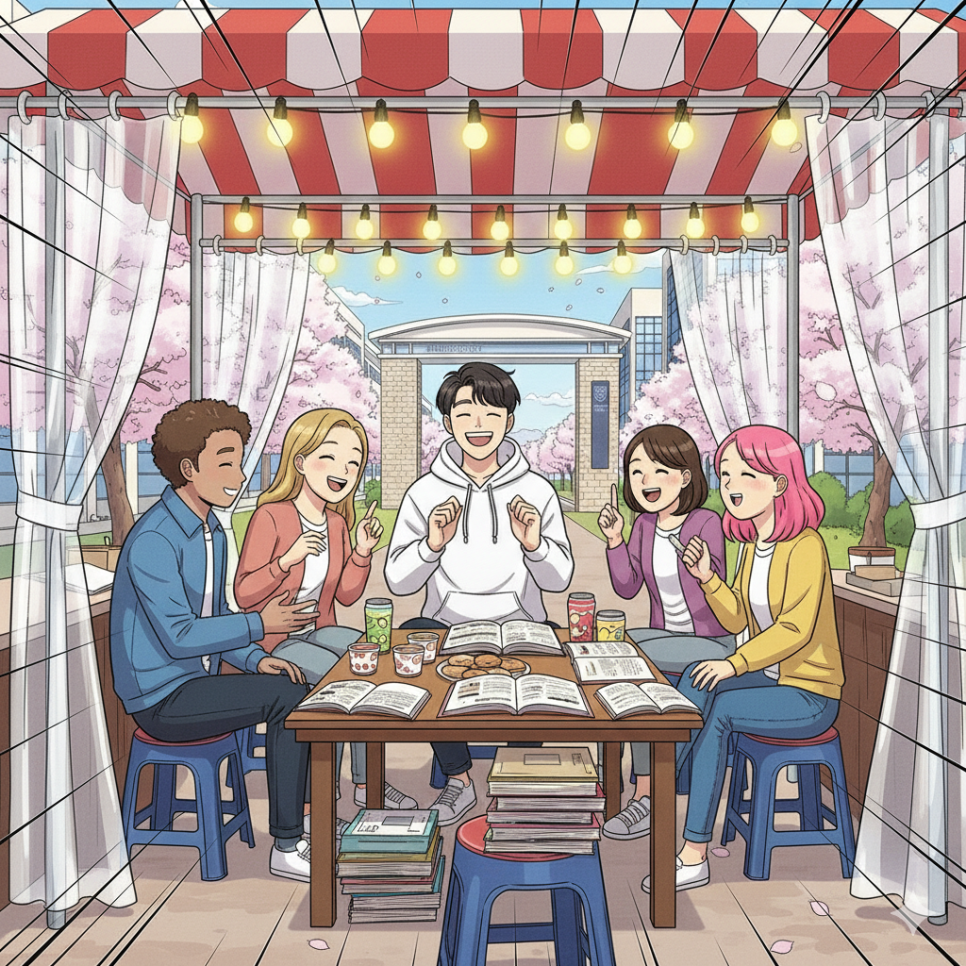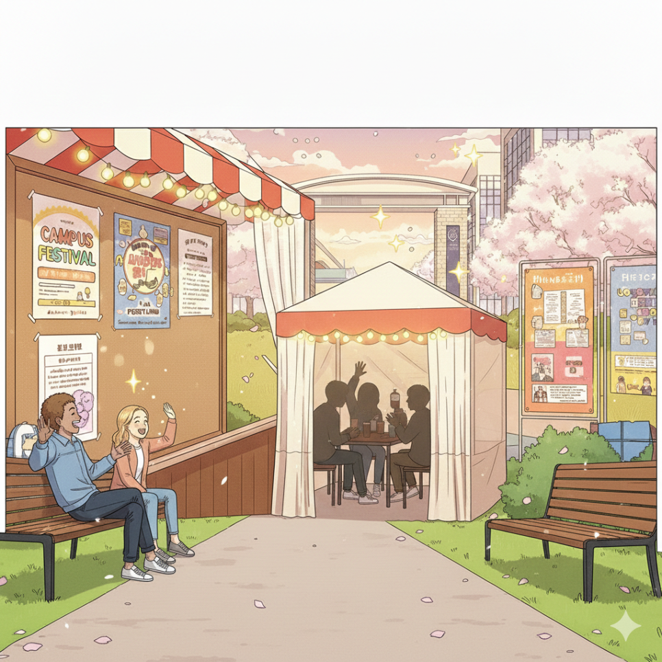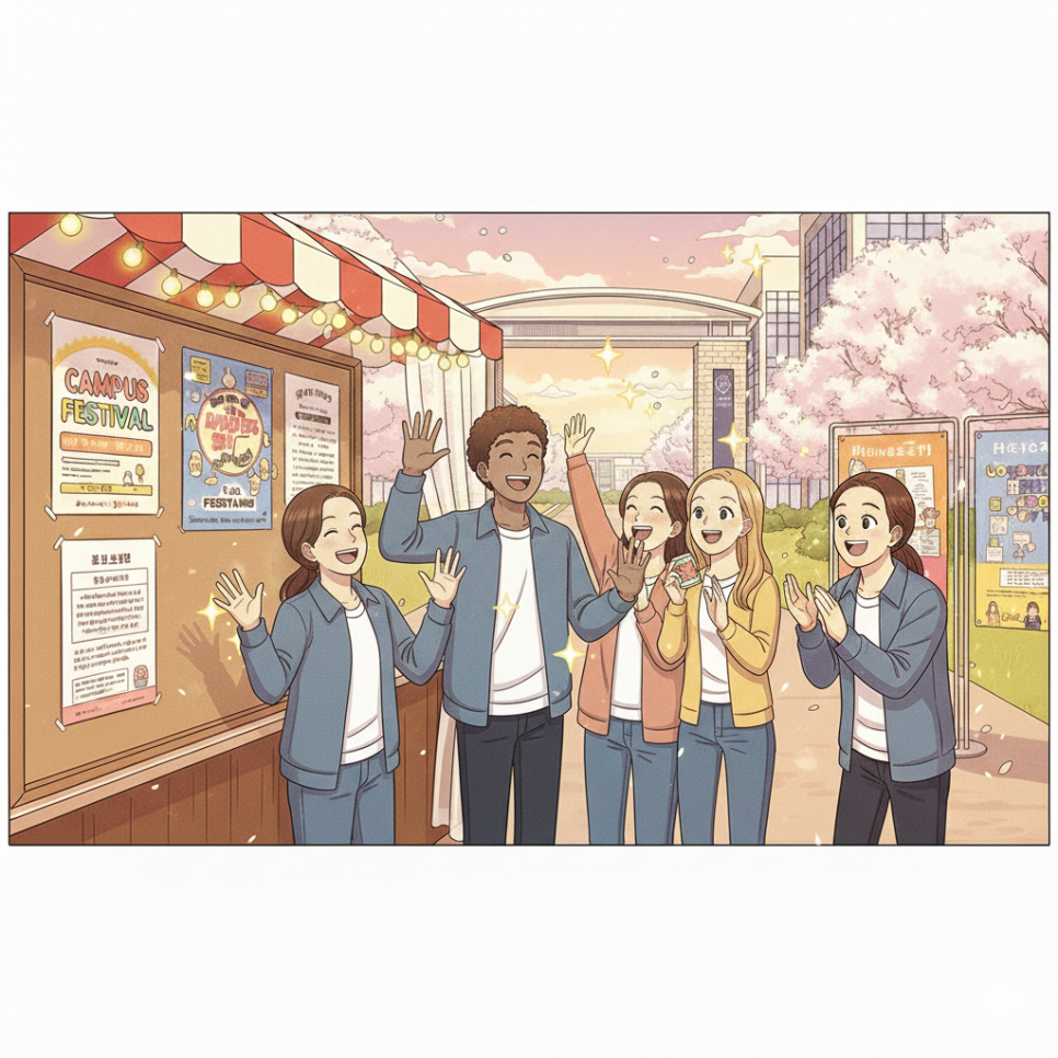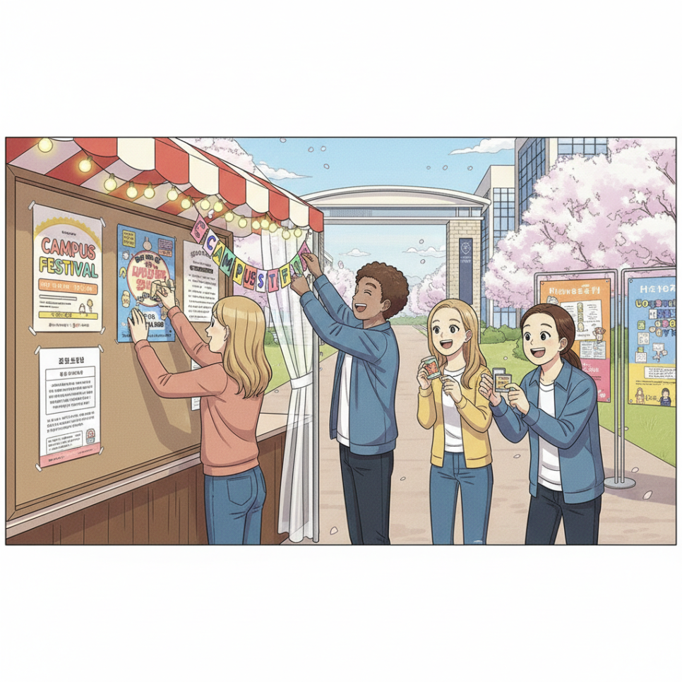 캠퍼스 축제를 앞두고, 모임 친구들은 작은 공간에서 준비를 시작했다. 포스터를 만들고, 장식을 붙이고, 작은 공연 연습도 했다. “우리 공간이 이렇게 활발하게 쓰일 줄 몰랐어!” 친구들의 웃음과 손길 속에서 모임은 더욱 특별한 의미를 가지게 되었다.