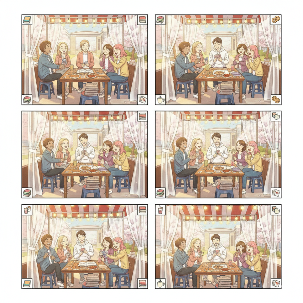 책만 보는 것이 아니라, 친구들은 소소한 게임으로도 즐거움을 찾았다. 단어 맞추기, 작은 그림 찾기 게임 등, 서로 장난치며 웃었다. “이번엔 내가 이긴다!” “아냐, 내가 이길 거야!” 게임 속 경쟁과 웃음은 모임의 또 다른 매력으로 자리 잡았다.