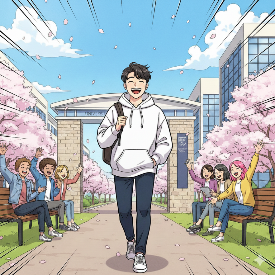 민재는 드디어 새로운 대학 캠퍼스에 들어섰다. 높은 건물과 넓은 잔디밭, 바쁘게 오가는 학생들 사이에서 민재의 가슴은 두근거렸다. “여기서 재미있는 일들이 기다리고 있겠지?” 마음속으로 다짐하며 강의실로 향하던 민재는 점심시간, 벤치에 앉아 있는 몇 명의 학생들을 발견했다. 그들은 서로 웃으며 간단한 간식을 나누고 있었다. 민재는 조심스럽게 다가가 “같이 먹을래?”라고 물었다. 친구들은 밝게 웃으며 민재를 맞아주었다. 이렇게 민재는 첫 친구들을 사귀며 캠퍼스 생활의 첫 걸음을 떼었다.