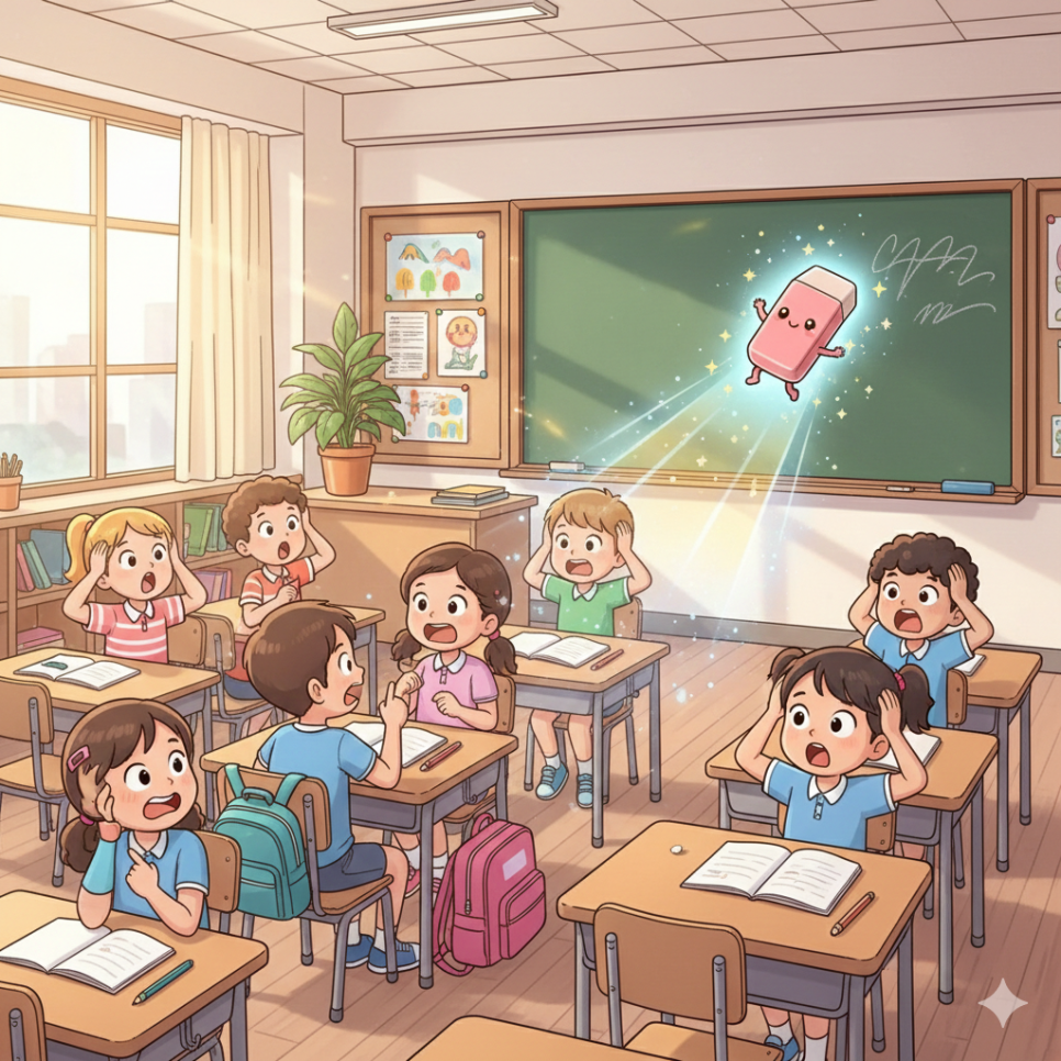 세리는 친구들과 함께 학교에 갔어요. 하지만 문제는 지구의 생활이 낯설었다는 거예요. 숫자도 다르고, 글자도 생소했지요. 수업 시간에 칠판에 적힌 글씨를 이해하지 못한 세리는 실수로 지팡이를 꺼냈다가 지우개가 저절로 움직여 글씨를 지워 버렸답니다! 아이들은 깜짝 놀라며 웅성거렸어요. 세리는 얼굴이 빨개져서 얼른 지팡이를 숨겼지요. “앞으로는 더 조심해야 해…” 세리는 속으로 중얼거렸어요.