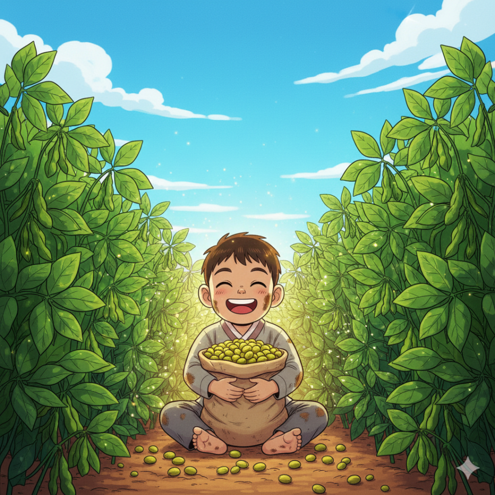 홀어머니의 마지막 말 한마디에 게으름뱅이 아들의 인생이 뒤집힙니다. 삽 한 자루를 들고 밭을 파기 시작한 아들. 그러나 아무리 파도 황금은 나오지 않고 흙먼지만 날립니다. 실망 끝에 심은 콩 한 줌이 뜻밖의 풍년을 이루고, 그 콩으로 만든 메주가 또 다른 기적을 만들어냅니다. 도둑과의 소동, 불길 속에서 피어난 구수한 향기, 그리고 원님의 뜻밖의 상까지. 이 이야기는 황금이 땅속에 숨겨져 있는 것이 아니라, 땀과 노력 속에서 자라난다는 사실을 유쾌하게 들려줍니다. 웃음과 재치가 가득한 만담 형식 속에서 어린이들은 자연스럽게 성실함의 가치를 배우게 됩니다. 게으름을 이겨낸 한 청년의 변화는 오늘을 살아가는 우리 아이들에게도 따뜻한 용기를 건넵니다.