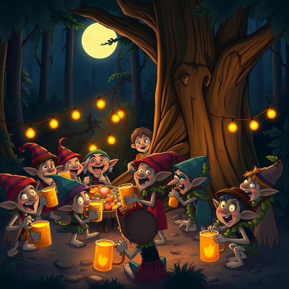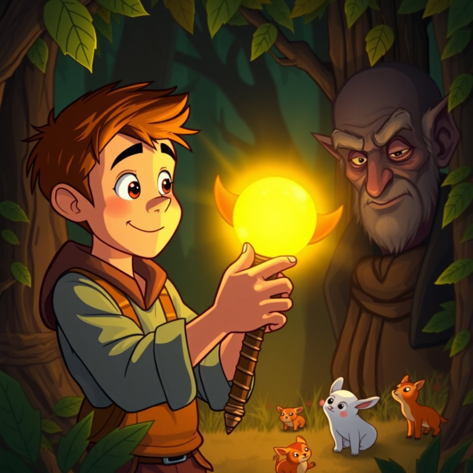 욕심쟁이 영감은 도깨비 방망이를 손에 넣을 생각에 밤잠까지 설쳤습니다. 그는 총각이 도깨비 방망이를 얻었던 깊은 산속으로 몰래 향했어요. 총각이 했던 것처럼 길을 잃은 척 숲 속을 헤매기 시작했죠. "어디쯤이었더라… 그 도깨비 녀석들이 나타났던 곳이…" 영감은 주변을 두리번거리며 일부러 큰 소리로 노래를 부르기도 하고, 춤을 추는 척 странные 행동을 하기도 했습니다.