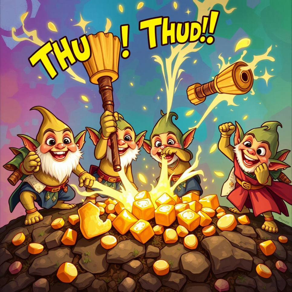 도깨비들이 방망이로 무엇이든 만들어내는 마법 같은 능력을 보여주는 장면.