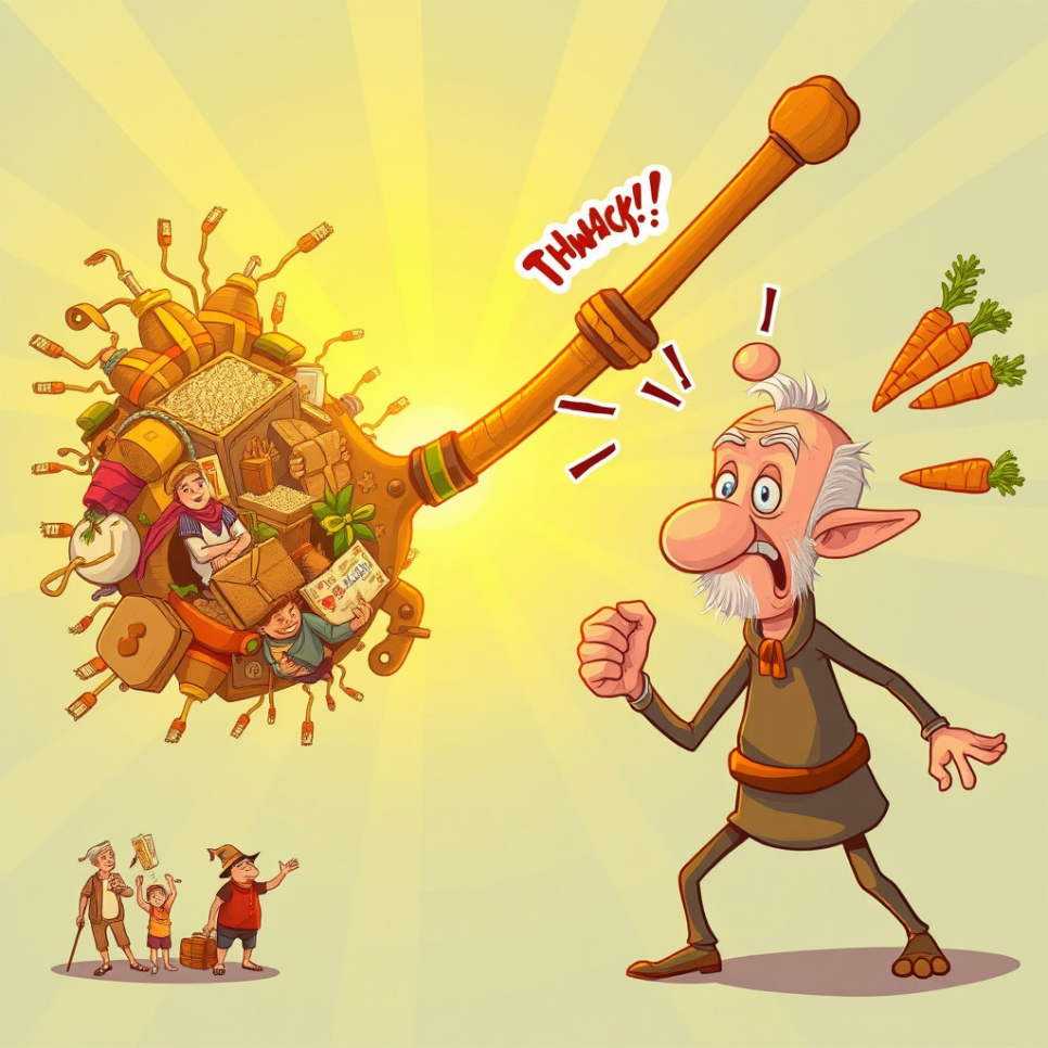 총각의 소문은 욕심쟁이 영감의 귀에 들어가고, 영감은 총각의 뒤를 몰래 밟아 도깨비 방망이의 비밀을 알아냅니다. 질투심과 탐욕에 눈이 먼 영감은 자신도 방망이를 손에 넣기 위해 총각을 흉내 내어 산으로 들어가 도깨비들을 만납니다. 그러나 욕심으로 가득 찬 영감의 속셈은 금세 도깨비들에게 발각되고, 영감은 방망이로 혹독한 벌을 받게 됩니다. 코에서는 당근이 튀어나오고 머리에는 혹이 솟아나는 등 우스꽝스러운 벌을 받는 영감의 모습은 지나친 욕심이 결국 자신에게 해가 되어 돌아온다는 중요한 교훈을 명확하게 전달합니다.