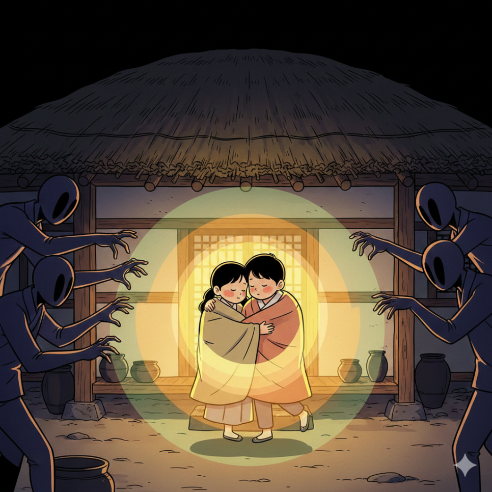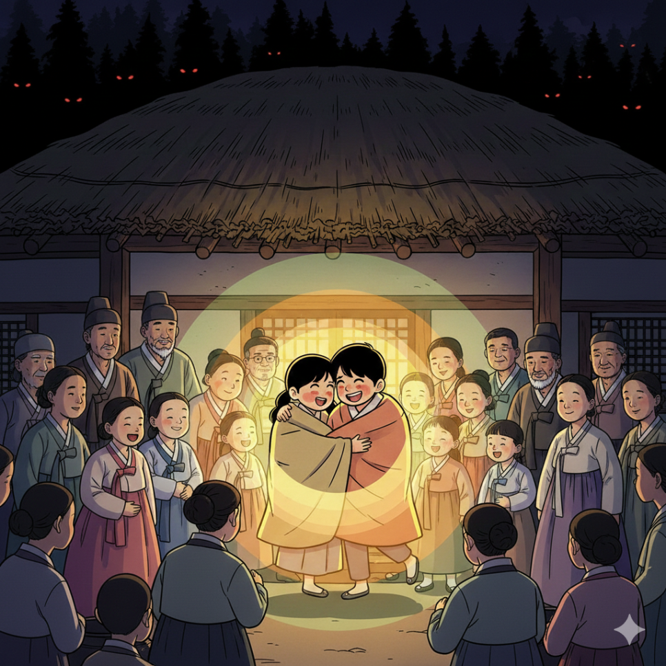 그 소망이 닿았을까요? 깊은 산골 마을의 작은 초가집에서 은은한 빛을 품은 쌍둥이 남매가 태어납니다. 아이들이 울면 방 안이 밝아졌고, 아이들이 웃으면 마을이 환해졌습니다. 사람들은 점점 두려움을 잊고 서로의 얼굴을 바라보게 됩니다. 빛은 단순히 밝음이 아니라, 서로를 알아보게 하는 힘이었기 때문입니다.