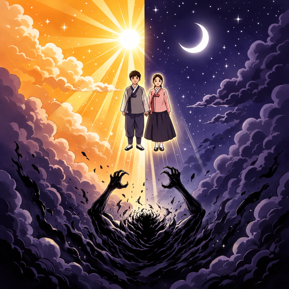 아주 먼 옛날, 세상은 캄캄한 어둠 속에 잠겨 있었습니다. 길도 보이지 않고, 사람들의 얼굴도 알 수 없던 시절. 그때 작은 산골 마을에 은은한 빛을 품은 남매가 태어났습니다. 아이들이 웃으면 세상이 환해졌고, 사람들이 모이면 두려움은 조금씩 사라졌습니다. 하지만 어둠을 지배하던 존재는 그 빛을 질투하기 시작합니다. 결국 남매는 세상을 지키기 위해 하늘로 오르는 선택을 하게 되지요.
