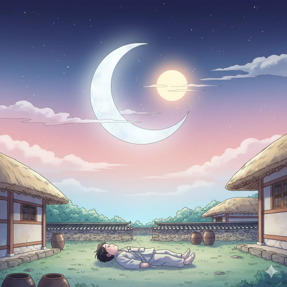 어느 여름밤, 한 아이가 마당에 누워 달을 바라보았습니다.