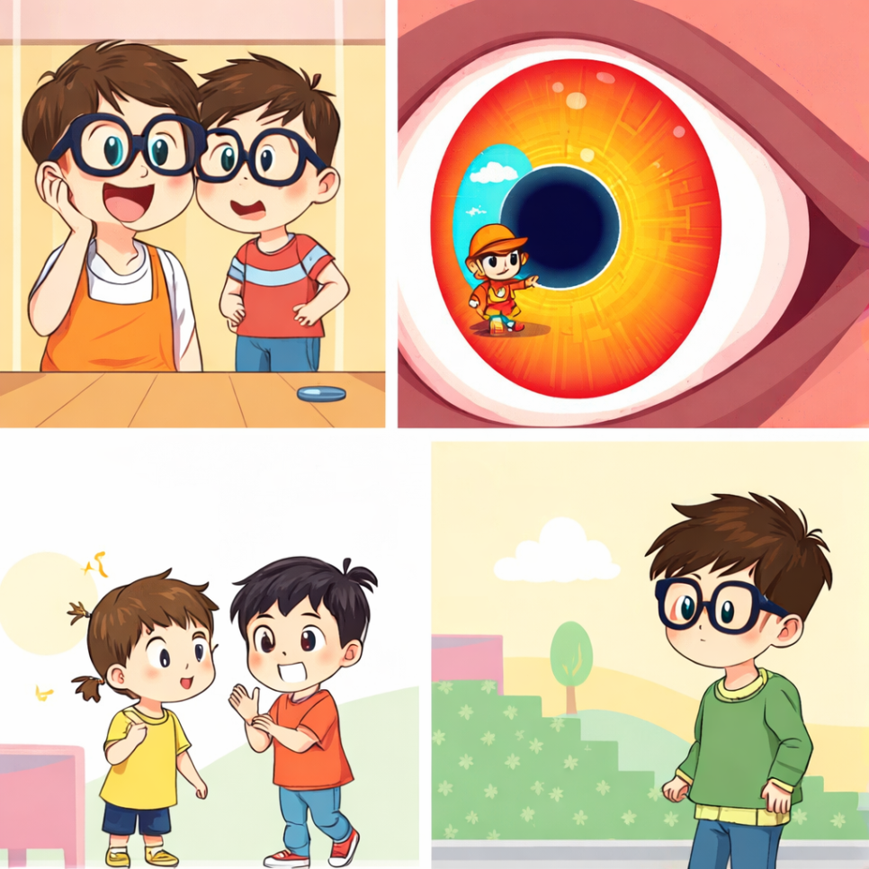 민수가 눈 검사를 기다리던 중, 놀랍게도 자신보다 어린 친구가 등장한다. 그런데 그 친구는 돋수가 무척 높은 안경을 쓰고 있어 눈이 반짝거린다. 민수는 깜짝 놀라며 생각한다. “어? 저 친구는 내보다 더 작은데… 눈은 어떻게 보지?” 친구는 밝게 웃으며, 돋수 높은 안경으로 세상을 보는 재미를 이야기해준다. 민수는 호기심 가득한 눈으로 친구를 바라본다.