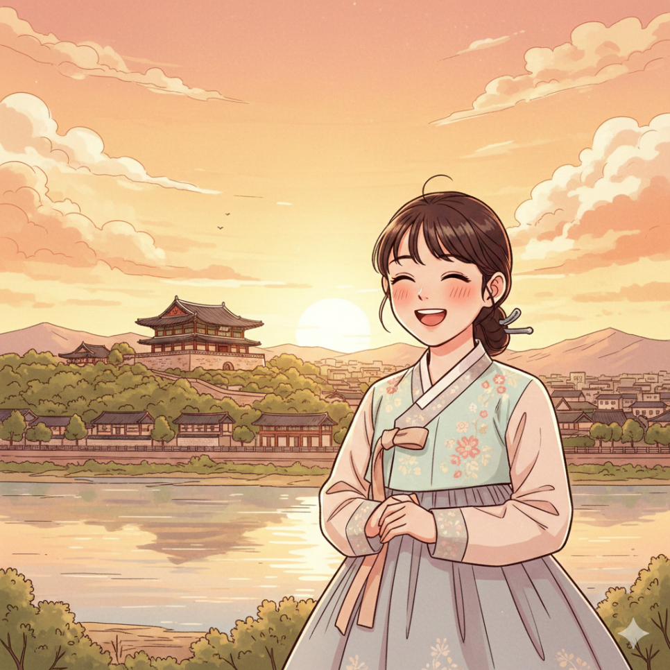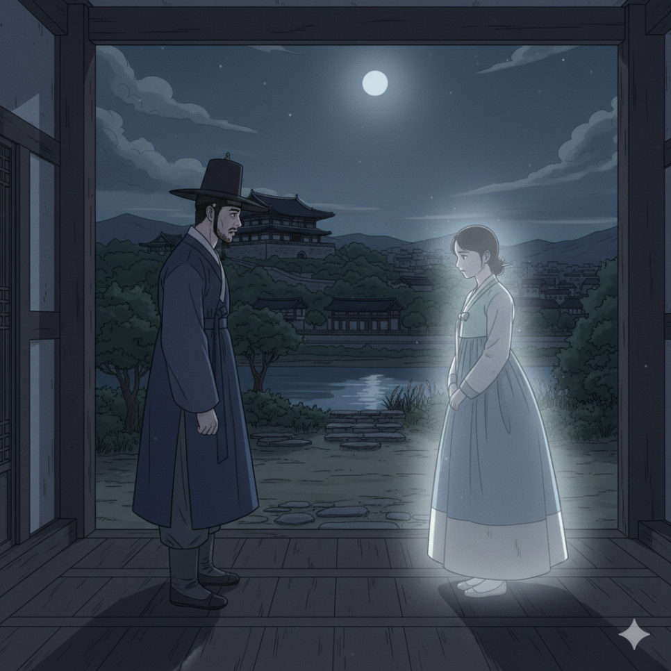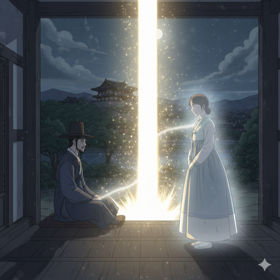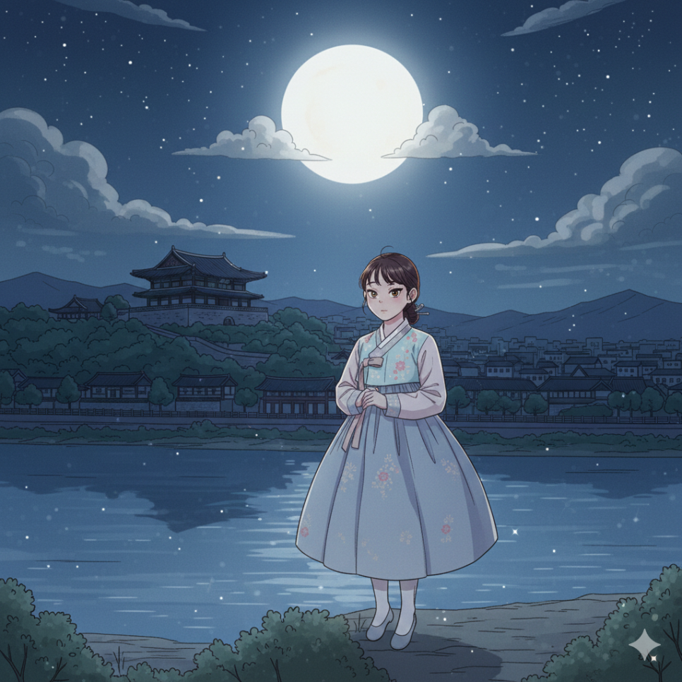 그 속에서 한 소녀가 조용히 모습을 드러냈지요. 고운 한복을 입었지만 얼굴에는 깊은 슬픔이 어려 있었어요.