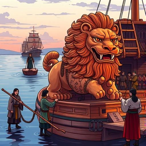 배가 출발하자 모두 숨을 죽였다. 신라 병사들이 사자를 보고 놀라 외쳤다.