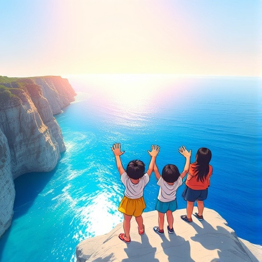 그날 저녁, 붉은 노을이 바다를 물들이고 있었다. 아이들은 절벽 위에 모였다. 하루와 라온, 그리고 또래 친구들이 둥글게 손을 잡았다.