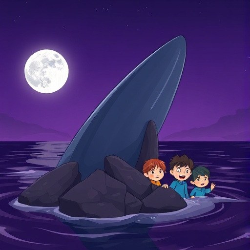 용기를 내어 가까이 다가가자, 그것은 거대한 고래였다. 달빛에 비친 등지느러미가 괴물처럼 보였던 것이다.