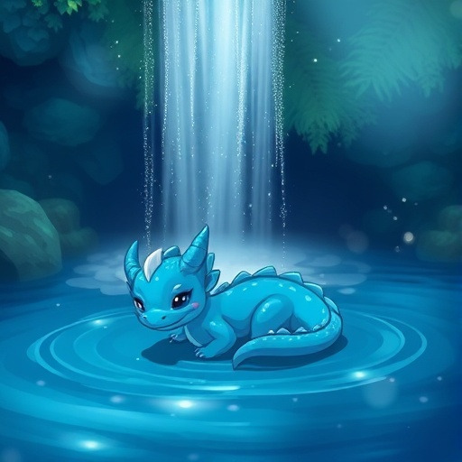 푸른 용은 소년과 마을을 마지막으로 바라보고 힘차게 폭포를 따라 바다로 뛰어듭니다. 그리고 거대한 물기둥과 함께 하늘로 솟아오릅니다.