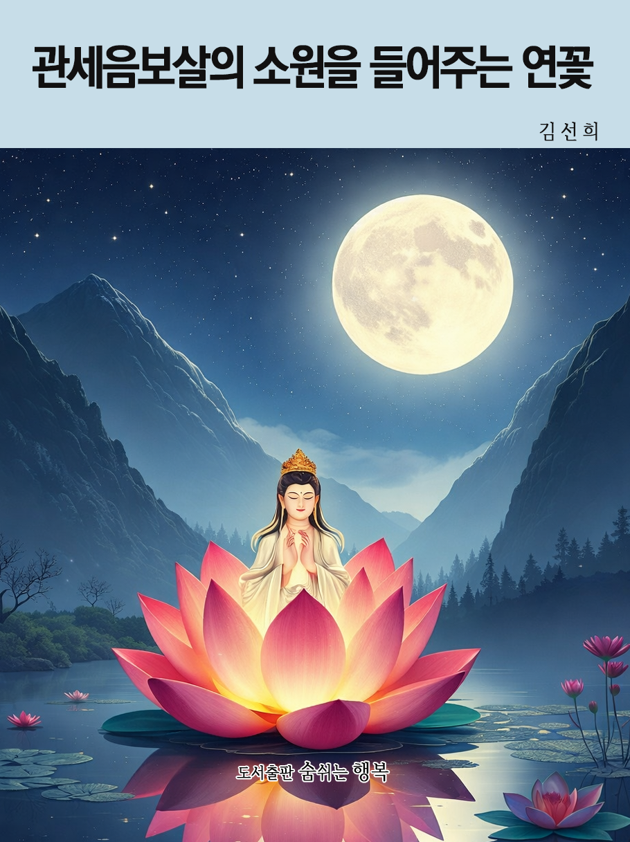 그곳에는 은은한 빛을 내는 큰 연꽃이 하나 있고, 그 연꽃 속에는 관세음보살이 머물고 있습니다. 관세음보살은 세상 사람들의 울음과 기도를 들으며 도움이 필요한 곳으로 조용히 빛을 보내 줍니다.
