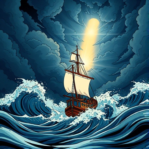 폭풍 속에서 위험에 처한 어부들이 기도할 때 바다 위에 빛의 길이 나타납니다.