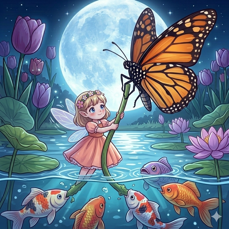 엄지는 허리띠에서 실 한 가닥을 풀어 나비 허리에 살짝 묶었어요. 나비가 날개를 푸드덕 하자 연꽃잎 배가 바람처럼 달리기 시작했어요! 엄지는 신나서 두 팔을 벌리고 외쳤어요. "야호! 나는 자유야!" 물고기들이 첨벙첨벙 물을 튀기며 응원해 주었답니다.