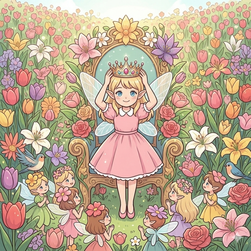 엄지는 두 뺨이 장미처럼 빨개졌어요. 그리고 고개를 끄덕였어요. 꽃들이 일제히 활짝 피어나며 축하해 주었고, 나비들이 꽃잎을 뿌렸어요. 제비도 기쁨의 노래를 불렀지요. 엄지의 머리 위에 꽃으로 만든 왕관이 씌워지는 순간, 이 작은 공주는 비로소 깨달았어요. '진짜 행복은 나 자신을 사랑하고, 다른 이를 사랑하는 마음 안에 있구나!'