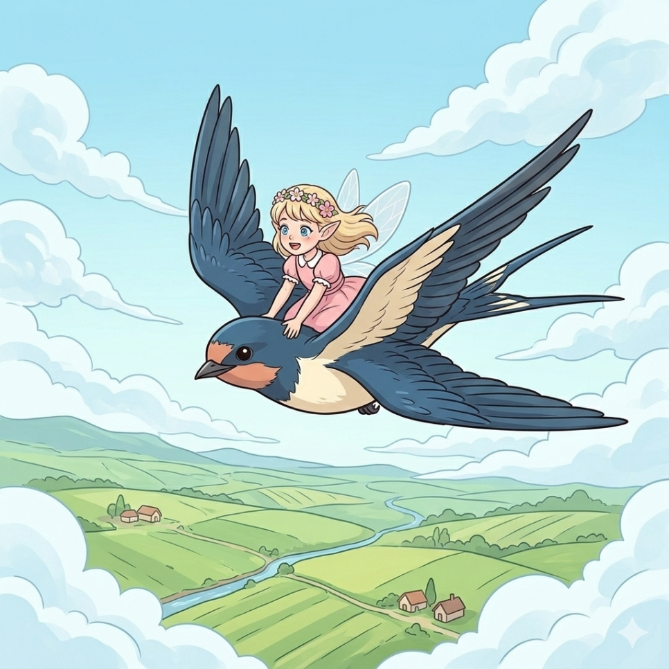 제비는 힘차게 날개를 펼쳤어요. 순식간에 땅이 멀어지고, 나무들이 작아졌어요. 하늘이 눈앞에 가득 찼어요! 구름 사이를 가르며 날아갈 때 엄지는 두 팔을 활짝 벌리고 웃었어요. 이제 어디로 가든 두렵지 않았어요. 저 아래로 넓은 들판과 반짝이는 강, 꽃밭이 펼쳐졌답니다.
