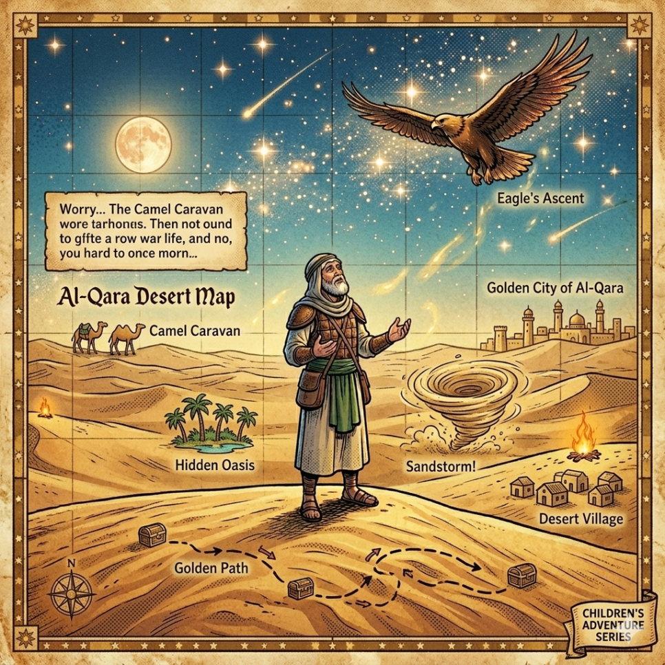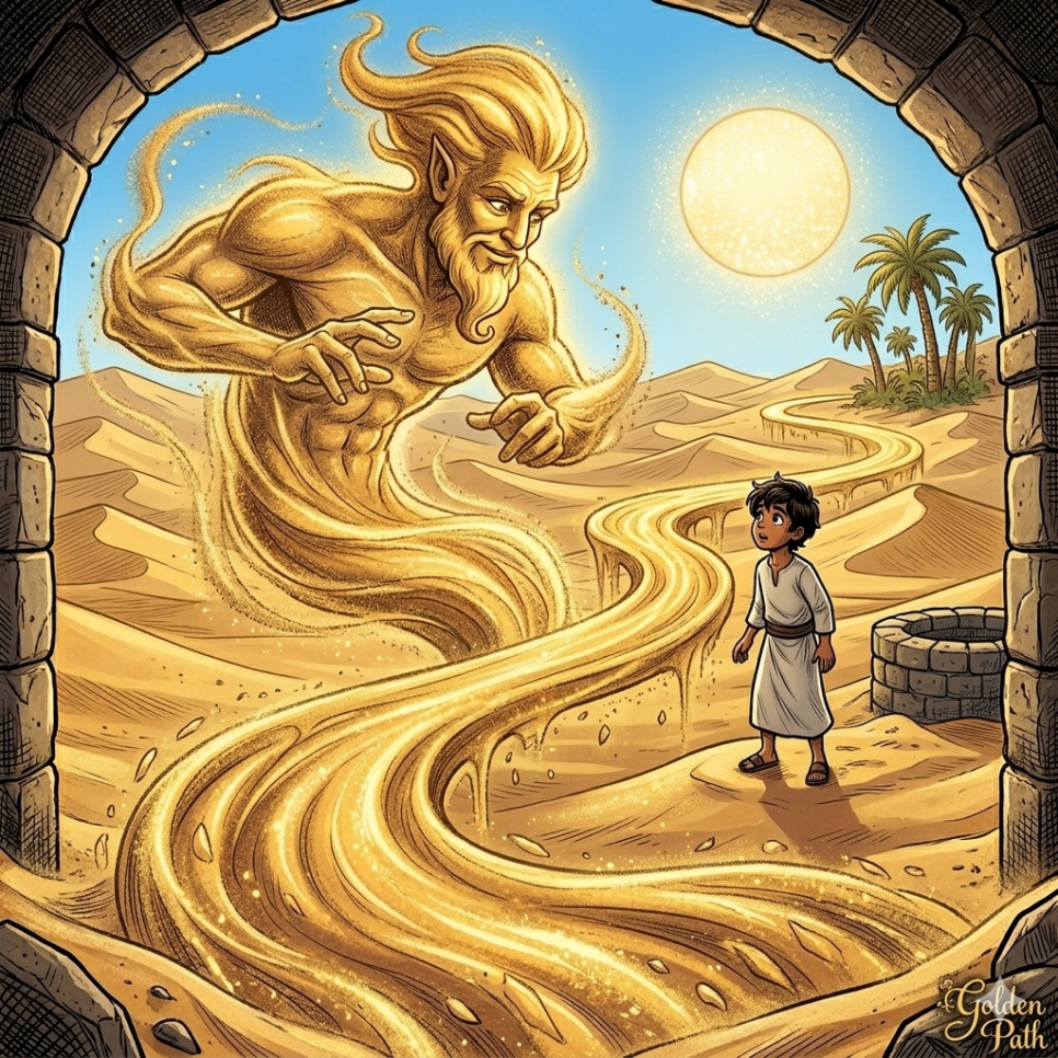 어느 날 밤, 거센 모래바람이 불던 밤에 아민은 이상한 속삭임을 듣게 됩니다. 그리고 다음 날, 오래된 우물에서 정말로 사막의 정령을 만나게 됩니다. 정령은 사막 깊은 곳에 숨겨진 생명의 샘이 점점 사라지고 있다며 아민에게 도움을 부탁합니다.