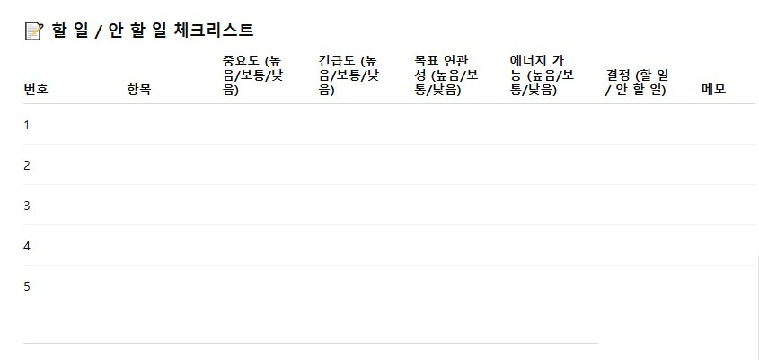 안 할 일: 목표와 직접 관련이 없거나, 단기적 만족만 주는 일.