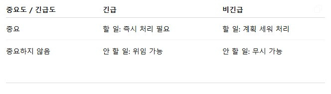 중요하지 않음 + 긴급 → 위임 가능 / 안 할 일